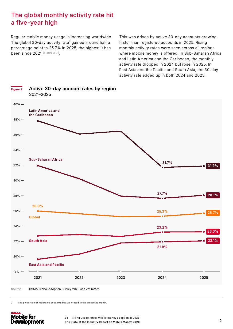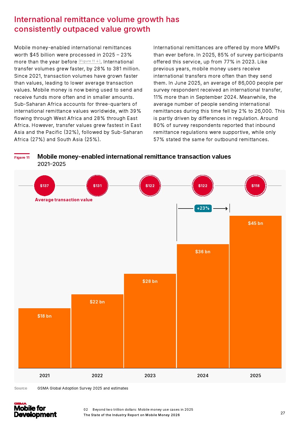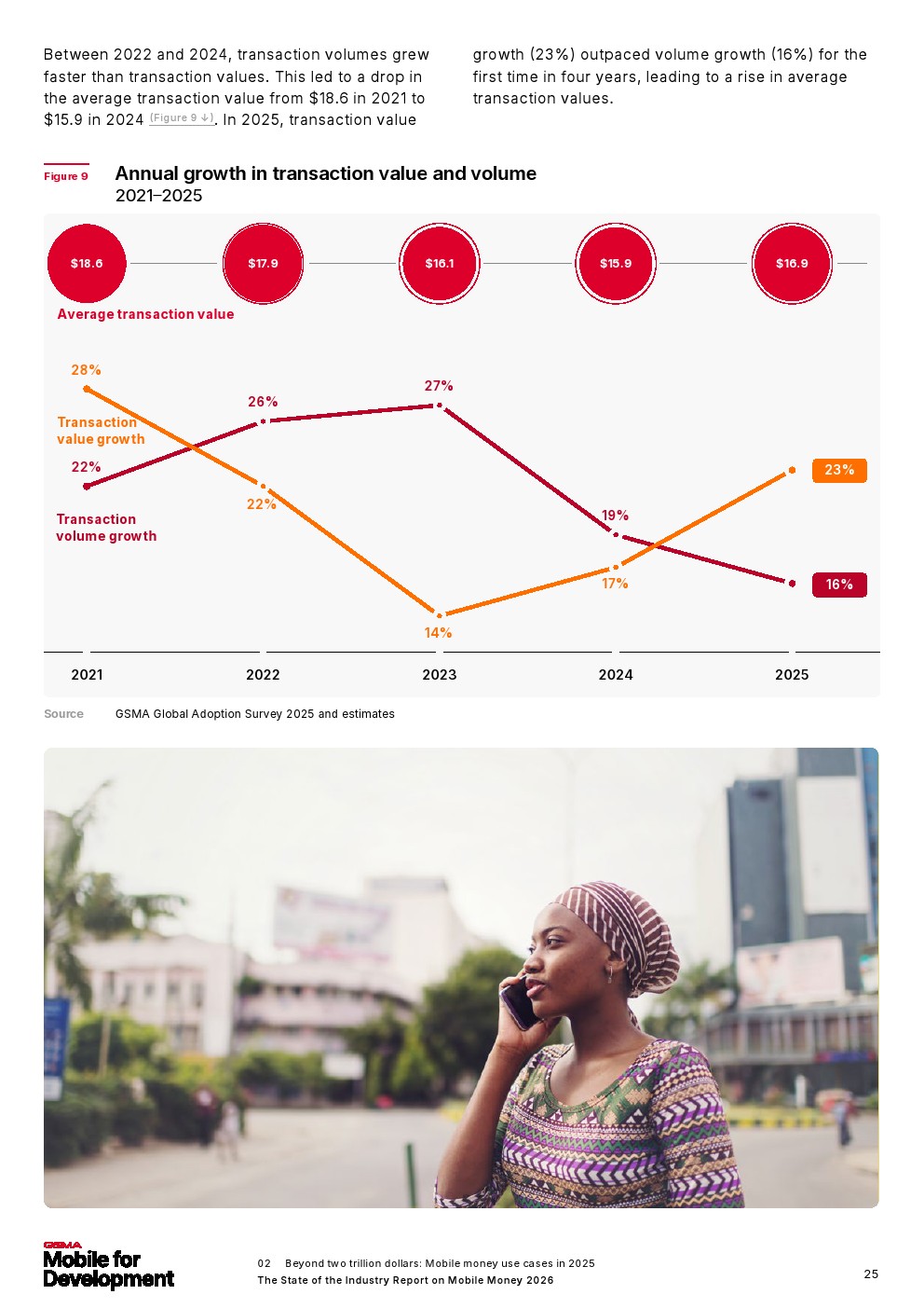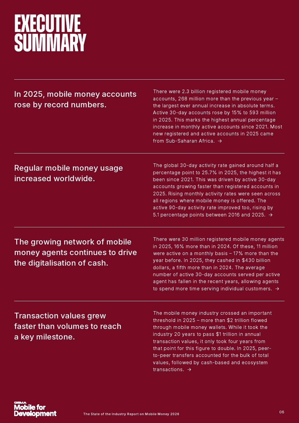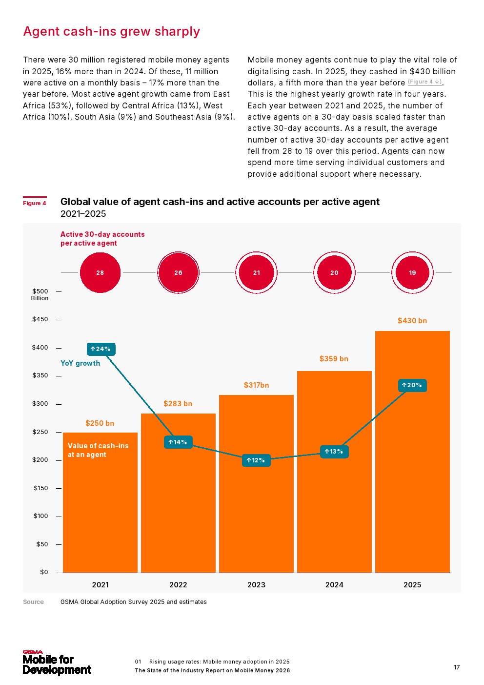 移动货币诞生仅25年,如今已成为全球服务不足人群的主流金融服务,赋能那些无法获得传统银行服务的人群,并为移动货币所在国家的经济增长做出贡献。报告还发现,2025年移动货币注册账户达到23亿,增长了2.68亿。