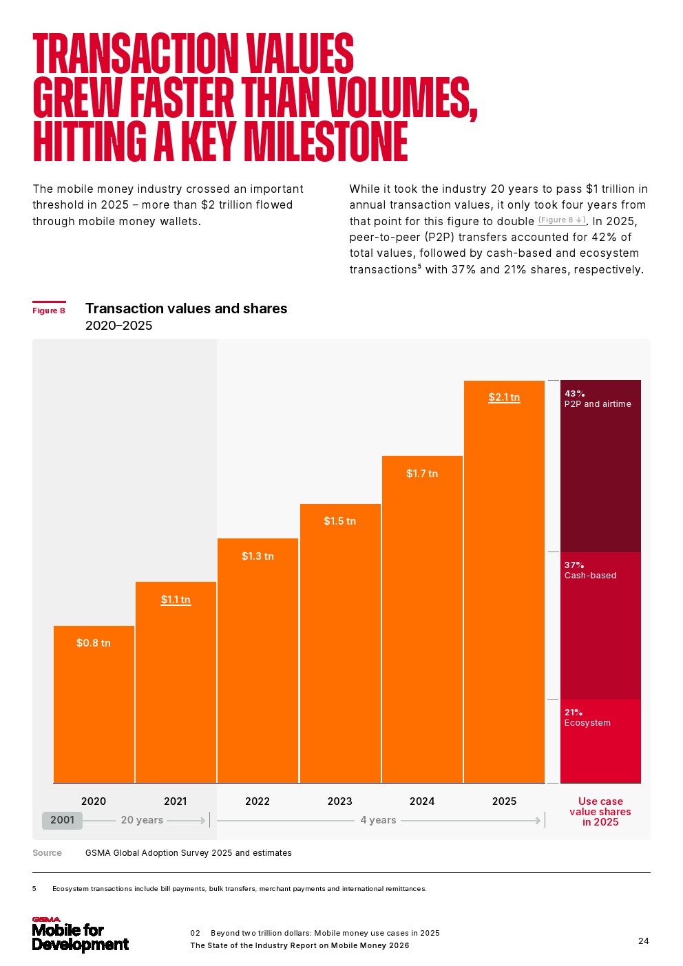 2025年移动货币交易额达2万亿美元,自2021年以来翻了一番,活跃账户持续增长。根据报告,2025年全球通过移动货币钱包流转的资金超过2万亿美元。这是一个重要的里程碑,体现了该行业近年来交易价值的指数级增长。年交易额突破1万亿美元用了20年时间,但这一数字翻倍仅用了四年。