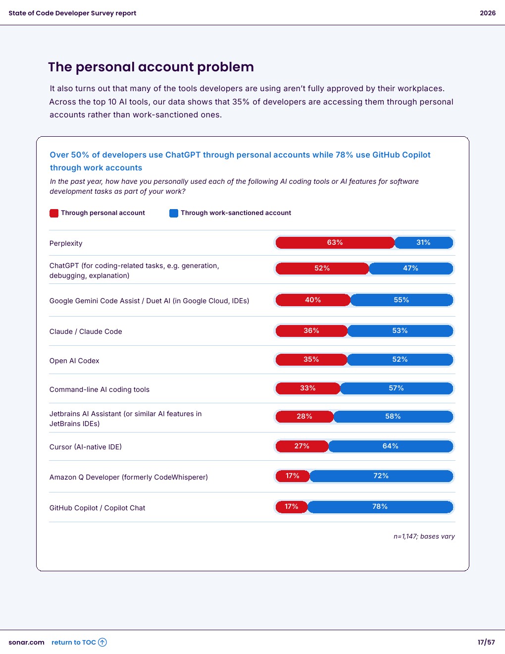 但35%的开发者通过个人账户使用工具,带来数据泄露与合规风险。