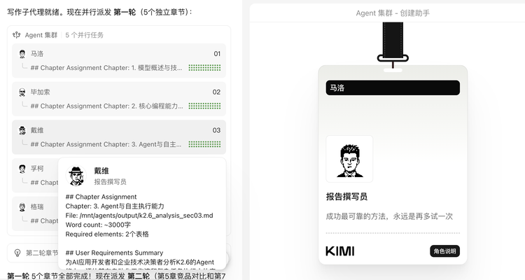 汇总后,Kimi 会对各 agent 产出的内容进行交叉验证,以纠正类似"K2.6 发布于 2025 年"这类错误。