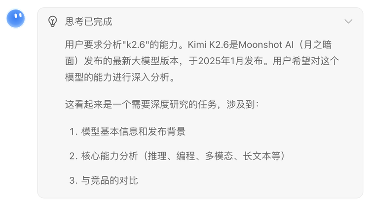 Kimi 首先对任务做整体判断,分析涉及哪些环节,这一步不联网,因此将 K2.6 识别为 2025 年发布的模型。