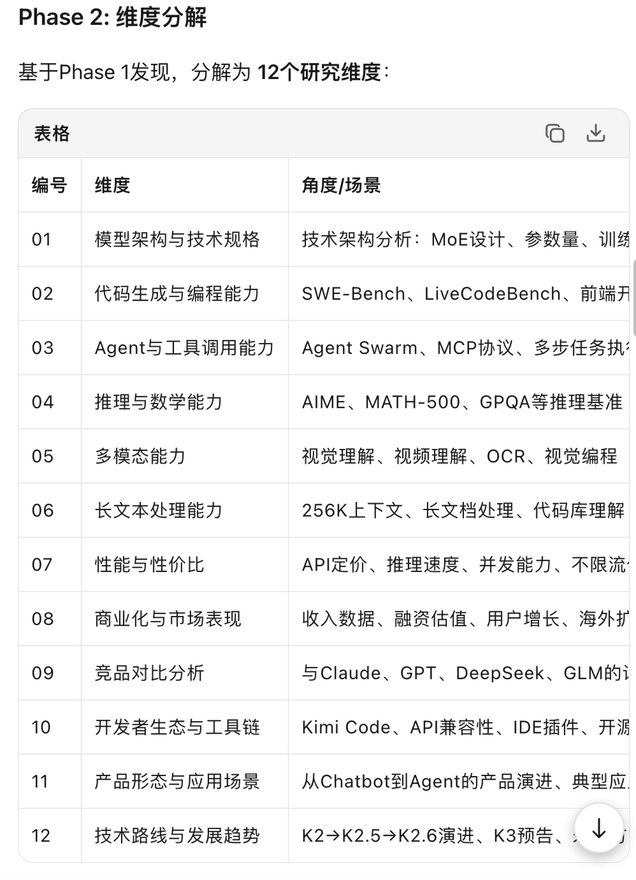 前两步由 K2.6 单一模型执行,第三步则根据拆解出的维度,每个维度派出一个 agent 并行展开研究。