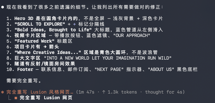 我们录屏了 lusion.co 网页的交互,滚动特效相当复杂,我们让 K2.6 根据视频写一个网页。(在 Claude Code 环境中)