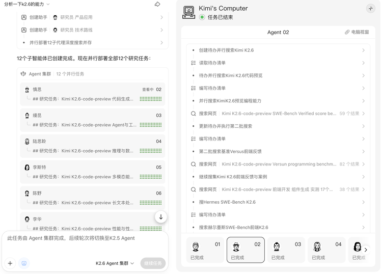 这一项能力在 Kimi 官网进行测试,采用 K2.6 Agent 集群分析 K2.6 本身的能力。