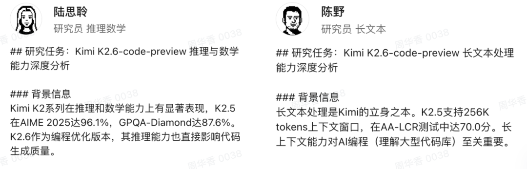 例如,"陆研究员"负责研究 K2.6 的推理能力,"陈研究员"负责研究长文本能力。