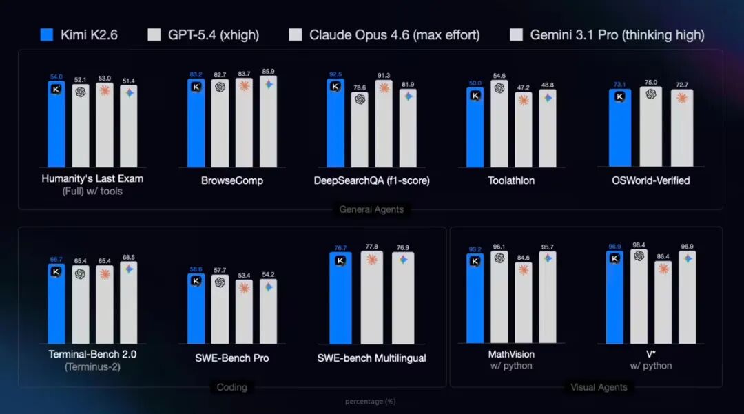 据官方披露,Kimi K2.6 在博士级难度的完整版「终极人类考试」(Humanity's Last Exam)、评估真实软件工程能力的 SWE-Bench Pro 以及 Agent 深度检索基准 DeepSearchQA 等测试中,均取得了行业领先的成绩,表现持平或优于 GPT-5.4、Claude Opus 4.6 和 Gemini 3.1 Pro 等闭源模型。