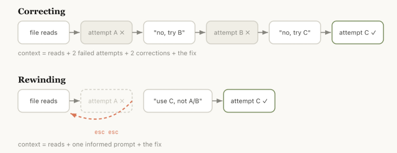 更聪明的做法是,回溯到模型刚刚读取完文件那一刻,用你新学到的信息重新下达指令。“不要用方案A,foo模块没有暴露该接口,直接使用方案B”。