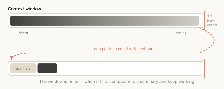 窗口容量存在硬性物理上限。逼近极限时,系统会自动将你正在处理的任务浓缩成一段简短描述,让模型带着精简记忆在全新的窗口中继续工作。
