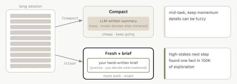 压缩是让模型自己提炼对话历史,用简短摘要替换长篇大论。操作过程存在细节损耗,好处是你不用亲自动手打字,Claude往往能更全面地保留重要的经验教训与文件信息。