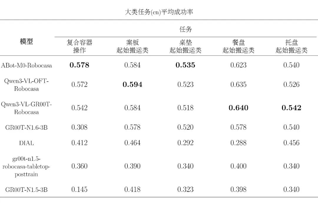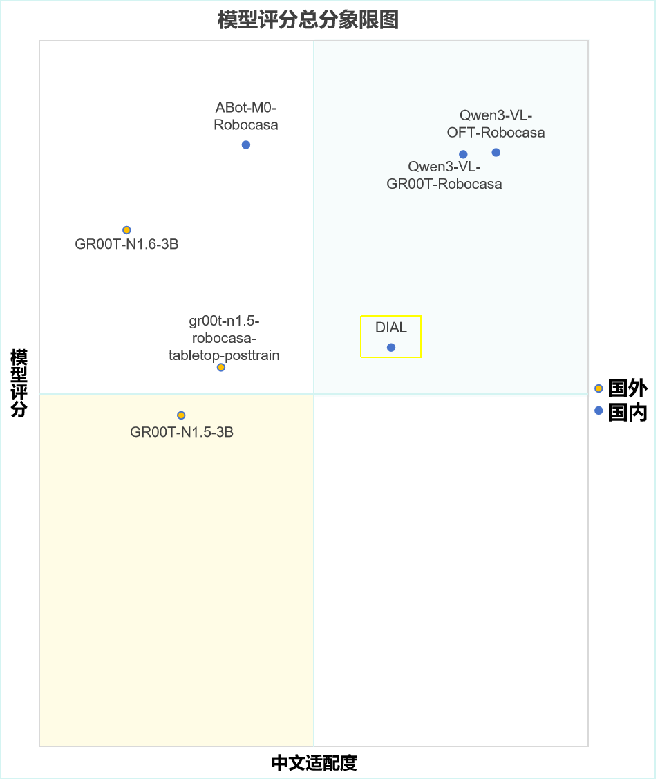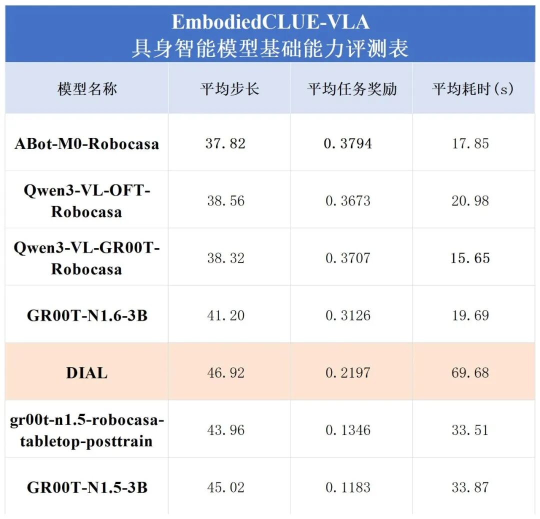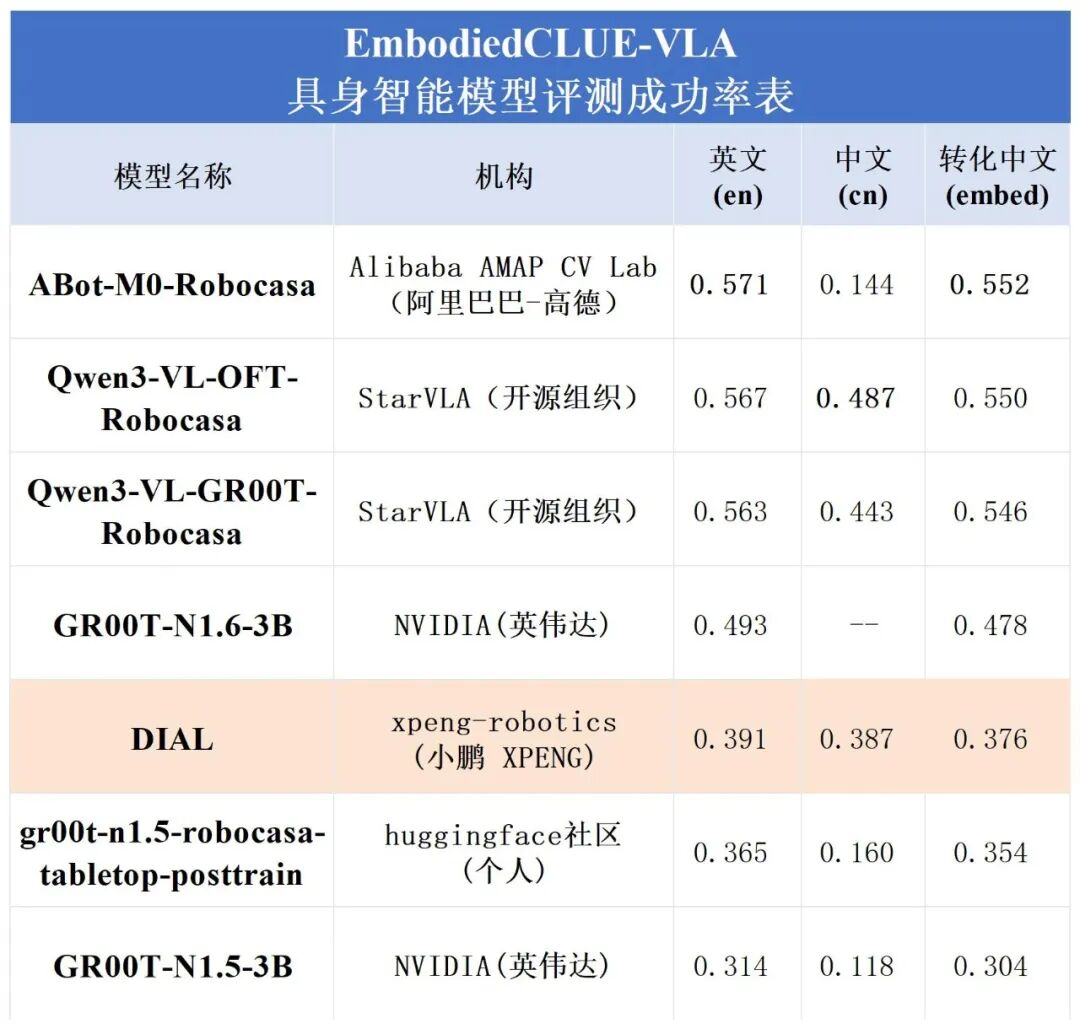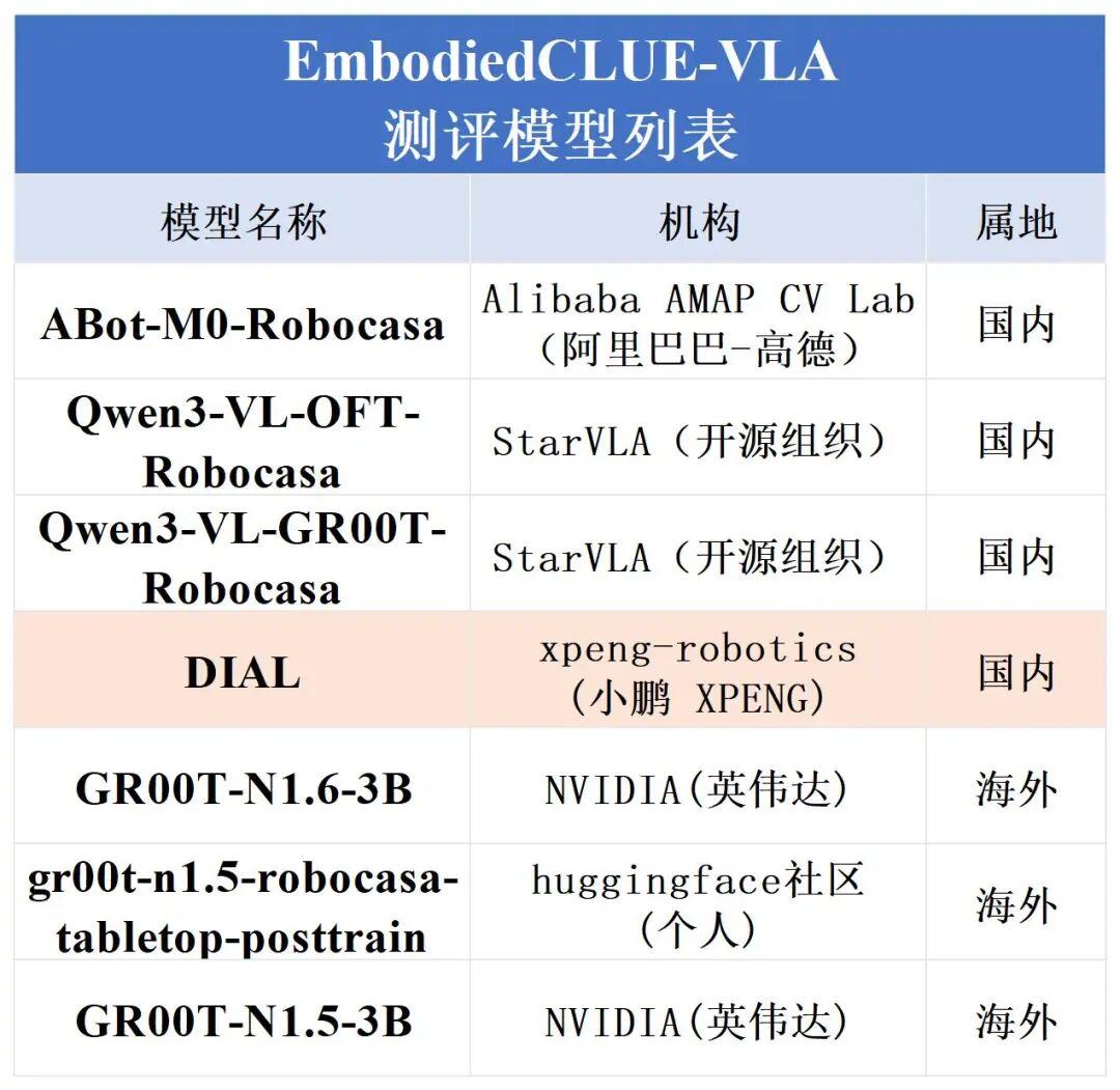 在上一阶段评测中,Robocasa-GR1-Tabletop 场景下六个公开模型的统一接入、统一评测与结果标准化已经完成,基准环境、任务设置与主要指标体系也已初步建立。为完善榜单,EmbodiedCLUE-VLA具身智能评测基准在本次评测中添加了小鹏机器人旗下xpeng-robotics实验室的DIAL模型参与评测。
