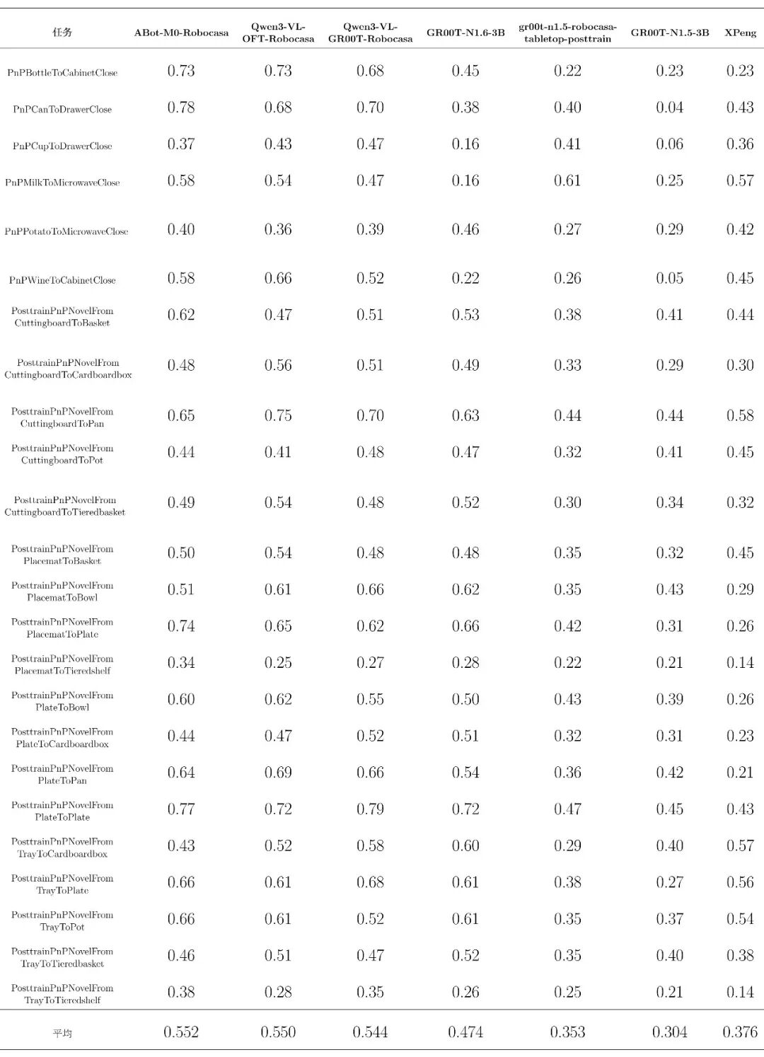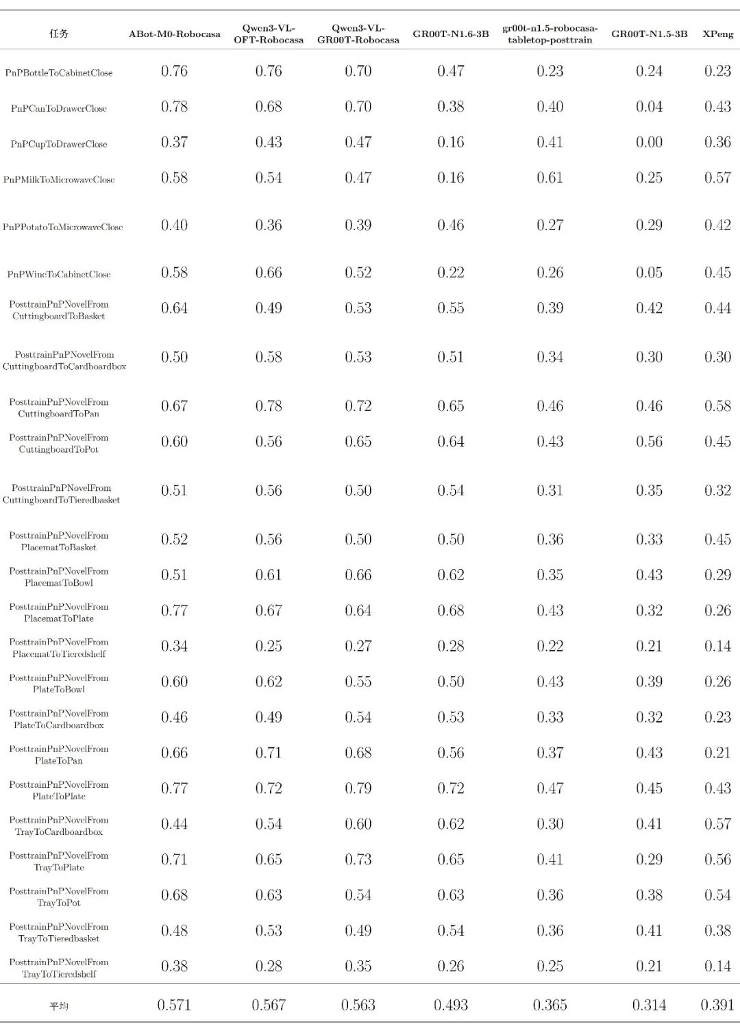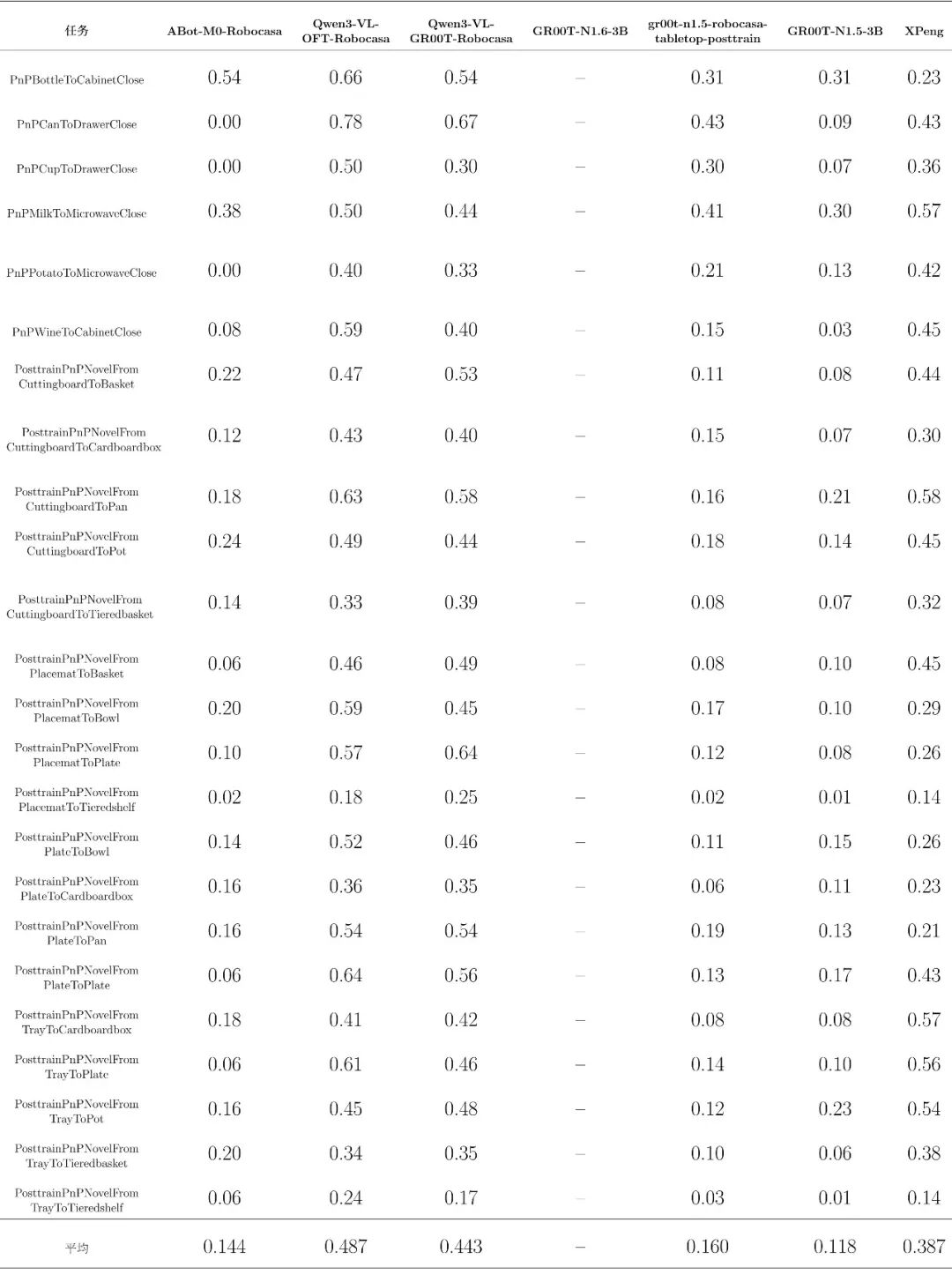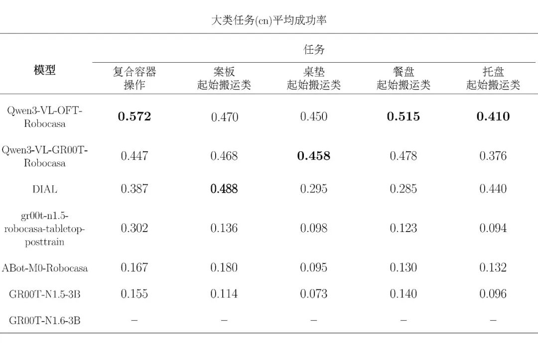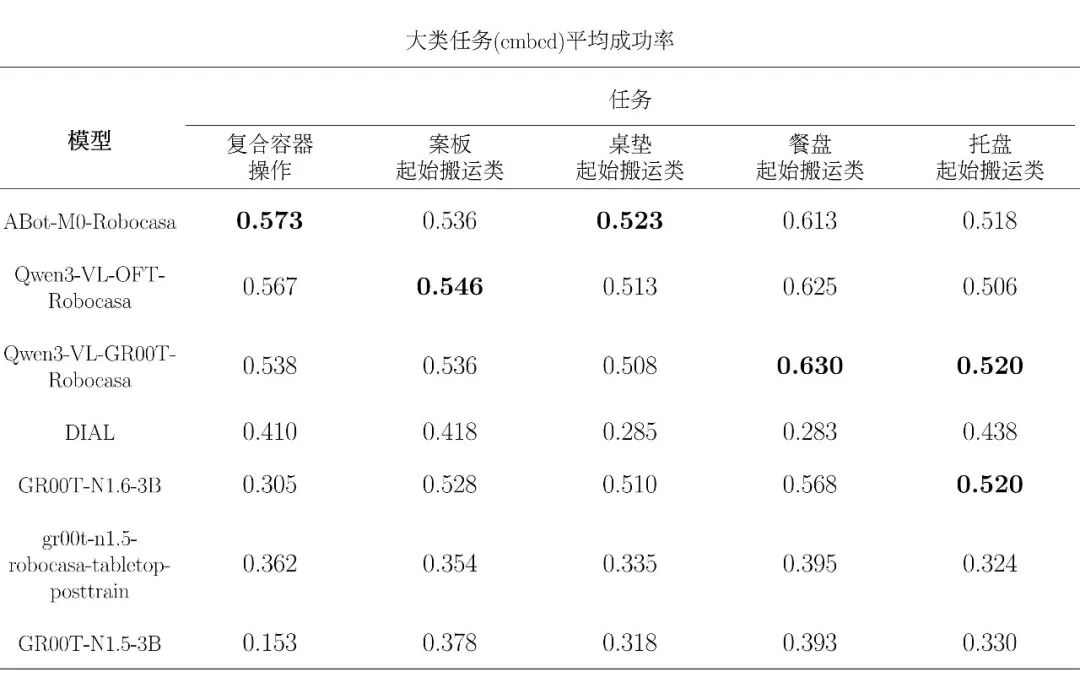 在上一阶段评测中,Robocasa-GR1-Tabletop 场景下六个公开模型的统一接入、统一评测与结果标准化已经完成,基准环境、任务设置与主要指标体系也已初步建立。为完善榜单,EmbodiedCLUE-VLA具身智能评测基准在本次评测中添加了小鹏机器人旗下xpeng-robotics实验室的DIAL模型参与评测。