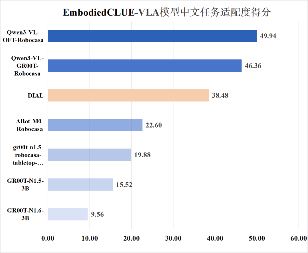 在中文适配方面,本轮评测中一个值得关注的现象是:DIAL 在部分任务上出现了原生中文成功率高于英文的情况。经评测链路逐层核查,可以确认中文指令在系统中被真实传入模型,该现象并非评测误差。进一步分析表明,这一结果并不意味着模型“更擅长中文”,而更可能源于其策略结构对语言变化的相对稳定性。在纯 VLA 模型中,语言差异往往会被直接放大至动作空间;而在 DIAL 中,语言首先被编码为高层语义条件,并通过多步推理过程影响动作生成,使得语言扰动在传递过程中被一定程度缓冲。当中文表达在个别任务中更直接地刻画目标语义时,便可能带来局部性能上的反超。