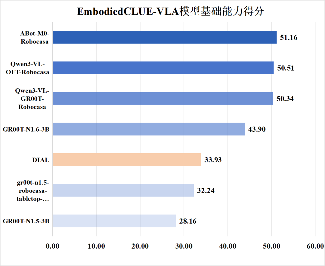 综合来看,在引入 DIAL 模型后,本轮评测不仅完善了榜单结构,也进一步揭示了不同具身智能模型在策略机制上的差异。基础能力上,DIAL 整体表现处于中下游区间,尚未在桌面操作任务中展现出明显优势;同时,其推理耗时显著高于多数模型,反映出其内部决策过程具有更高的计算复杂度。