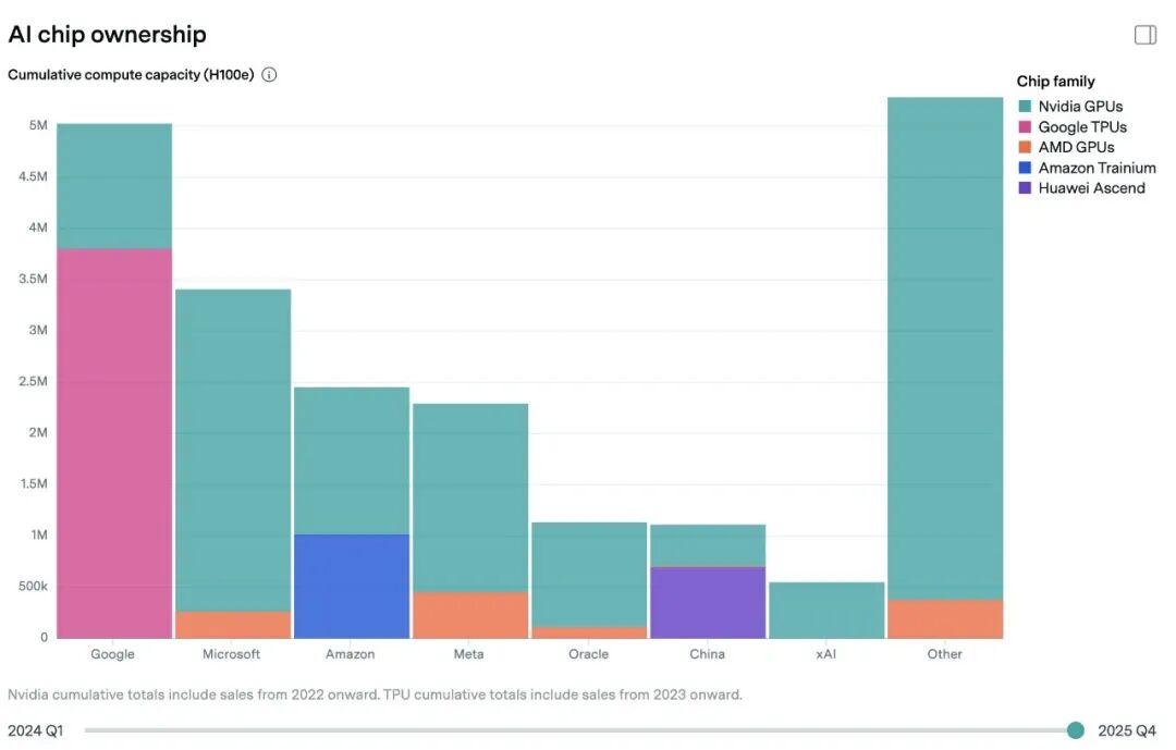 2024Q1-2025Q4美国和中国各大厂拥有的AI芯片 ,图源:Epoch AI