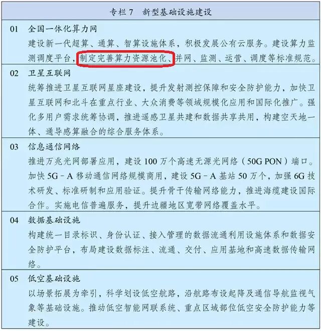 今年三月发布的《中华人民共和国国民经济和社会发展第十五个五年规划纲要》中明确提出:“适度超前建设新型基础设施 ...... 深入推进东数西算工程,构建多层次算力设施体系和全国一体化算力网 ...... 建设算力监测调度平台,制定完善算力资源池化,并网,监测,运营,调度等标准规范。”