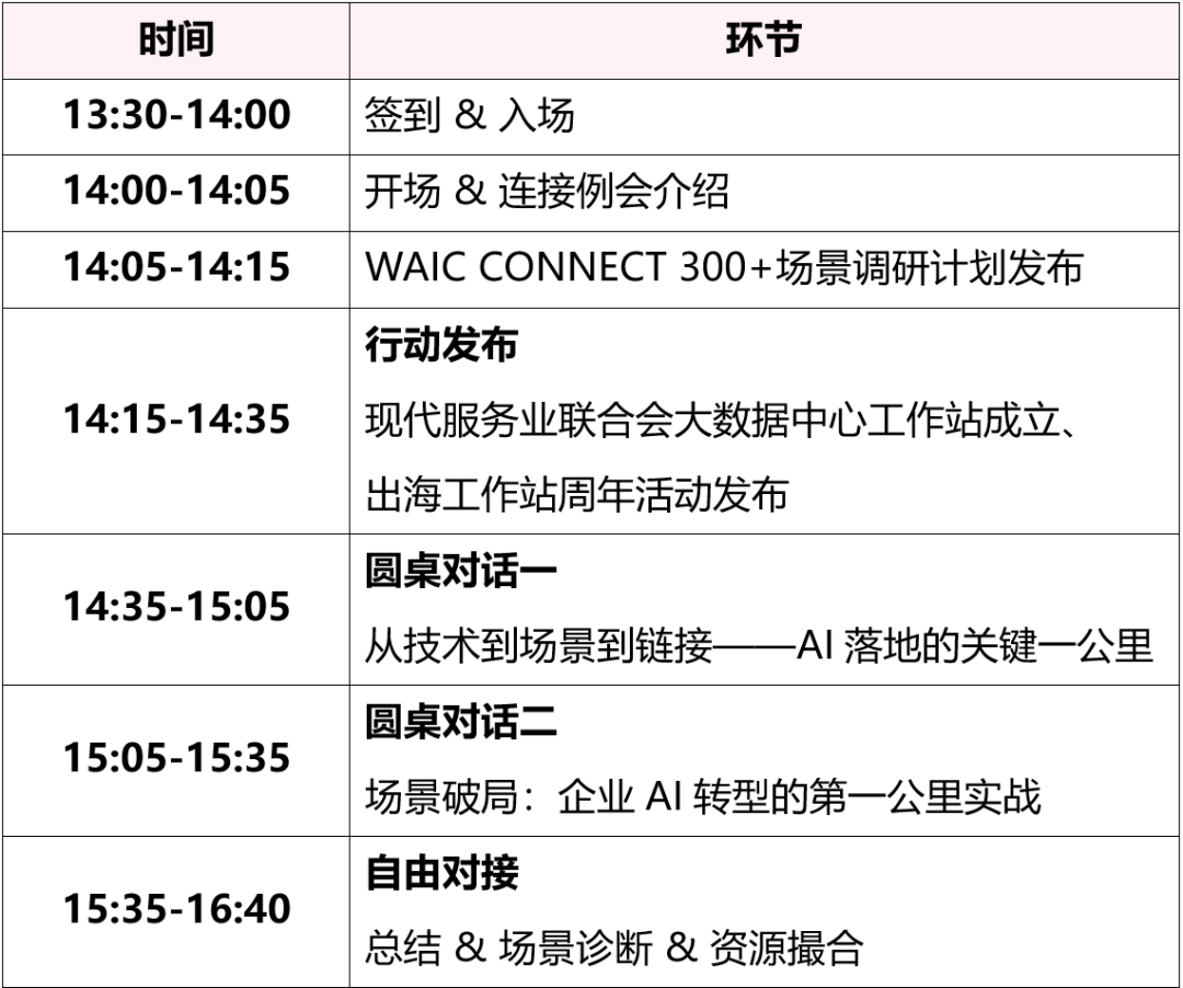 告别空谈趋势,直击落地根源。活动现场将由邱肃川(复旦大学智慧城市研究中心高级研究员、混沌学园创新领教)、丁勤慧(注册会计师、原德勤咨询总监、上海青联委员、上海青年科技人才协会委员)等WAIC CONNECT专家顾问领衔,协同现代服务业联合会、上海市城市更新研究会、上海市工商联数字经济商会等核心场景源头方,联合中汇事务所、清华系水木智能、飞书等多位资深咨询专家与标杆企业负责人,现场清晰拆解为何90%的AI项目难以推进,帮你从源头避开需求模糊、技术错配、协同低效三大陷阱,理清卡点、少走弯路,让AI项目从第一步就走稳走顺。2、资源汇聚:CONNECT全场景生态开放・年度产业资产重磅发布WAIC CONNECT 现场正式揭晓300+企业AI场景调研计划,同步举行与现代服务业联合会大数据中心的工作站揭牌成立仪式,构建覆盖多领域、全链条、高价值的产业资源生态。作为WAIC CONNECT全年产业触达体系核心入口,300家真实企业需求库将开放调研、分析、触达全流程权益,涵盖数字化瓶颈、应用场景、预算方向、决策重点、升级路径等核心信息,助力合作伙伴提前锁定产业痛点、精准匹配业务机会、联合发布研究成果,真正实现从“品牌曝光”到“需求共建”的价值升级,一站式掌握全年 AI 产业核心资源与高质量合作机遇。3、全球布局:出海工作站周年暨CGBN联盟正式升级当前中国科技企业正面临从“技术领先”到“全球落地”的关键跨越。为了打破信息孤岛,构建中国科技出海的“旗舰方舟”, WAIC CONNECT作为全球科技创新的连接枢纽,值出海工作站周年之际携手欧洲人工智能研究院、松江区商务发展促进中心、北京对话、观察者网、国际科技促进中心、中国马来西亚商会、金砖财经、弗若斯特沙利文、分众传媒、宁波银行、中科欧创集团、香港中华工商总会等生态伙伴共同升级为中国企业全球化商务联盟(CGBN联盟),整合跨境资源、打通全球渠道、构建合规体系,为中国AI企业全球化布局提供稳健支撑、高效通路与长期生态助力。本次活动特邀全球领先的消费者健康企业科赴(Kenvue)集团莅临参与。科赴前身为强生消费者健康,在守护每日健康方面已有逾135年的历史,业务遍及全球165个国家和地区。2023年5月,科赴于纽交所独立上市,正式成为一家独立的消费者健康公司。产品涵盖个人健康护理、皮肤健康与美容及基础健康等领域,通过诸多家喻户晓的品牌,向全球约12亿人传递力量,守护消费者的日常生活和生命中每一个重要时刻。集团旗下拥有科赴(上海)健康护理有限公司、科赴(上海)健康护理用品有限公司、上海强生制药有限公司、北京大宝化妆品有限公司等多家标杆智慧工厂,是产业数字化与 AI 落地的一线标杆场景方。本次活动科赴集团企业代表将亲临现场。特邀场景方代表带来真实业务需求分享,两场高端圆桌汇聚技术方、场景方、AI转型顾问深度对话;现场特设5个免费场景诊断名额、独立洽谈室与快速撮合通道,扫码即可进入需求库,优先获得后续1V1匹配服务,让交流直达合作、让需求对接方案、让资源高效转化。