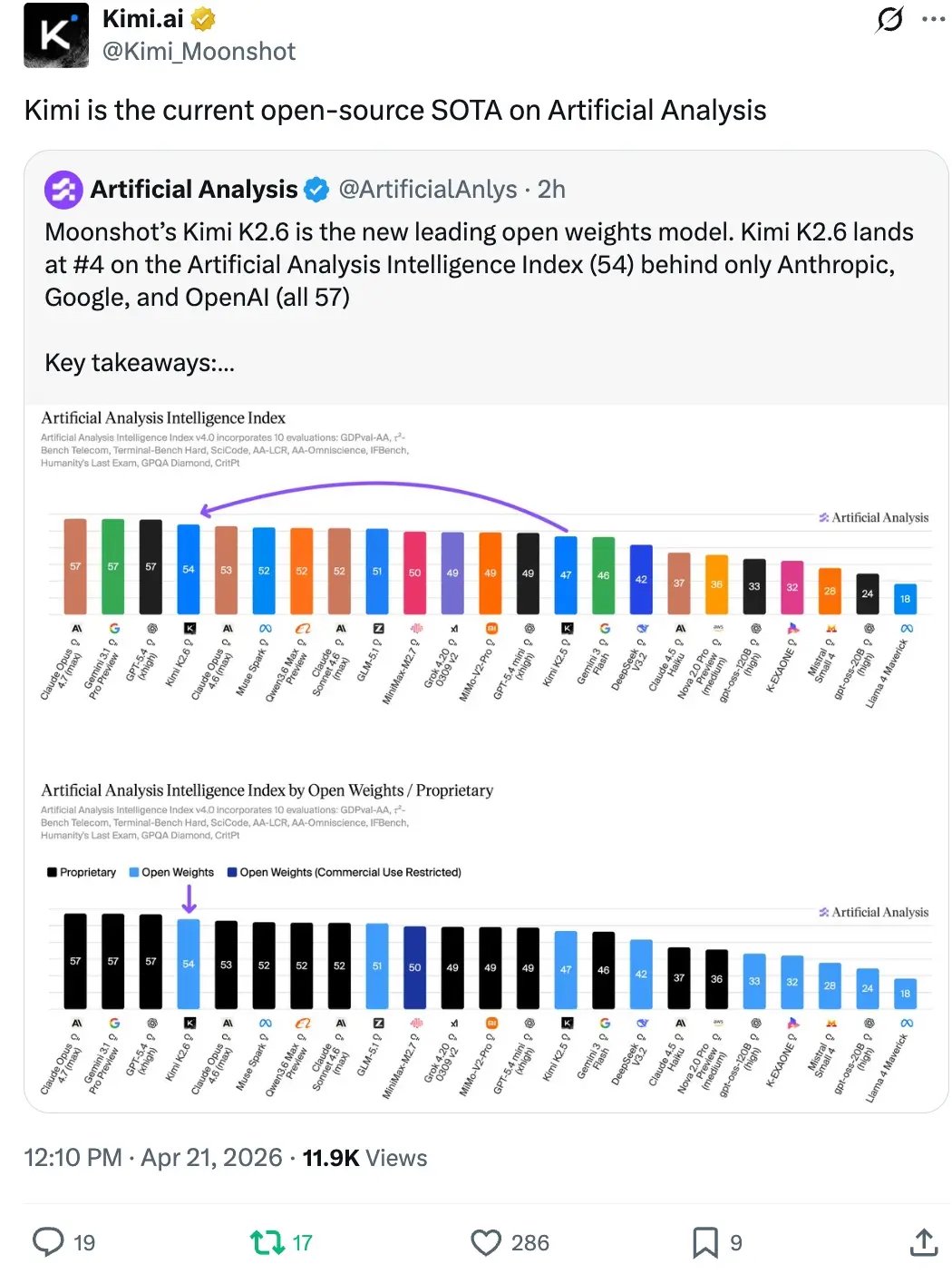 Kimi K2.6 是当前全球开源权重(Open Weights)大模型综合能力 SOTA|图片来源:X