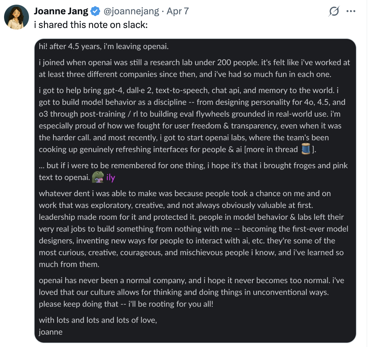 当地时间4月7日,被称为“GPT-4o之母”的Joanne Jang通过社交平台发布离职声明,结束了自己四年半的OpenAI职业生涯。这位斯坦福大学应用数学与计算机科学双学位持有者,并未披露离职的具体原因,仅简单回顾了在OpenAI的工作经历。