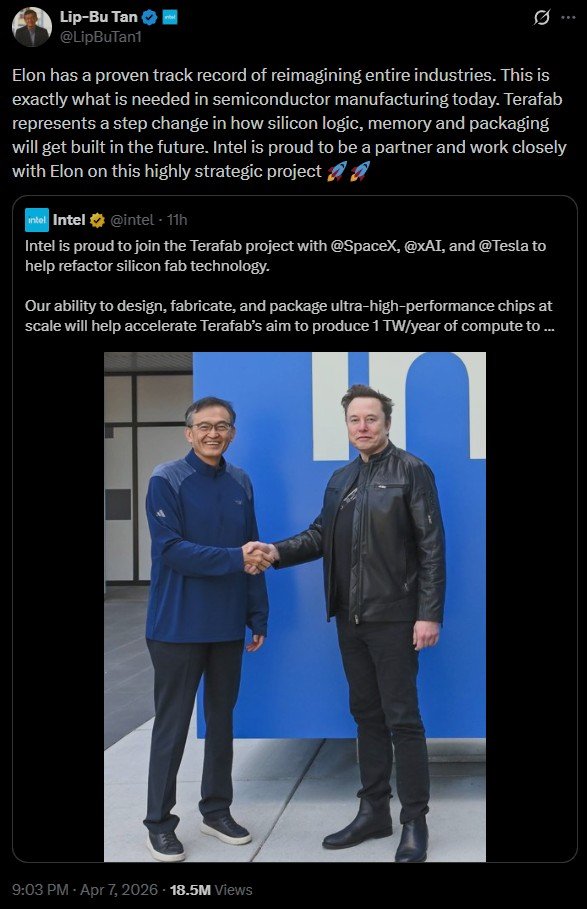 英特尔发表公告称,公司将参与埃隆·马斯克的Terafab超级芯片工厂项目,与SpaceX、xAI、特斯拉公司共同设计、生产、封装超高性能芯片: