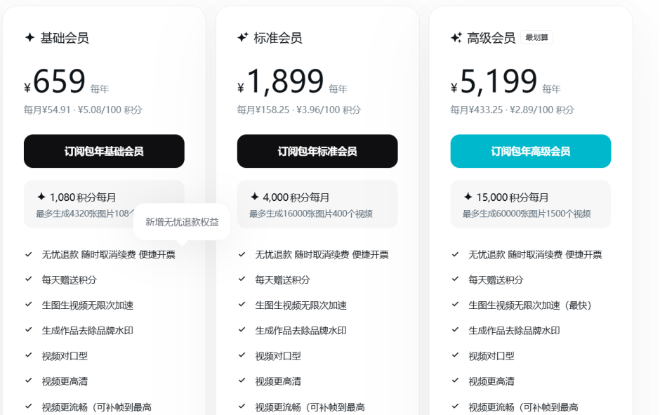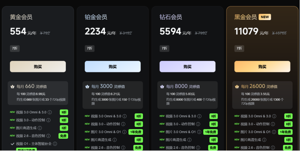 针对普通创作者,可灵黄金会员的入门门槛仅为66元/月,和竞争对手相差不大;但面向专业的广告商和影视公司,黑金会员的年费则高达11079元,远超即梦5199元/年的费用。