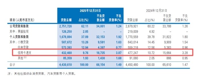 特别是信用卡业务,正成为民生银行资产质量的“新痛点”:不良贷款率从3.28%上升至3.87%,在已披露数据的股份行中不良率居前;对应不良余额达167.35亿元,占个人不良贷款总额比重过半。