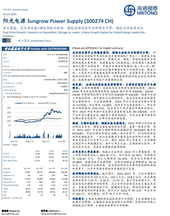 海通国际于2026年1月发布阳光电源的研报,标题为《首次覆盖:逆变器筑基+储能领航双驱动,储能高增长跃升为新增长引擎,锚定全球能源龙头》。