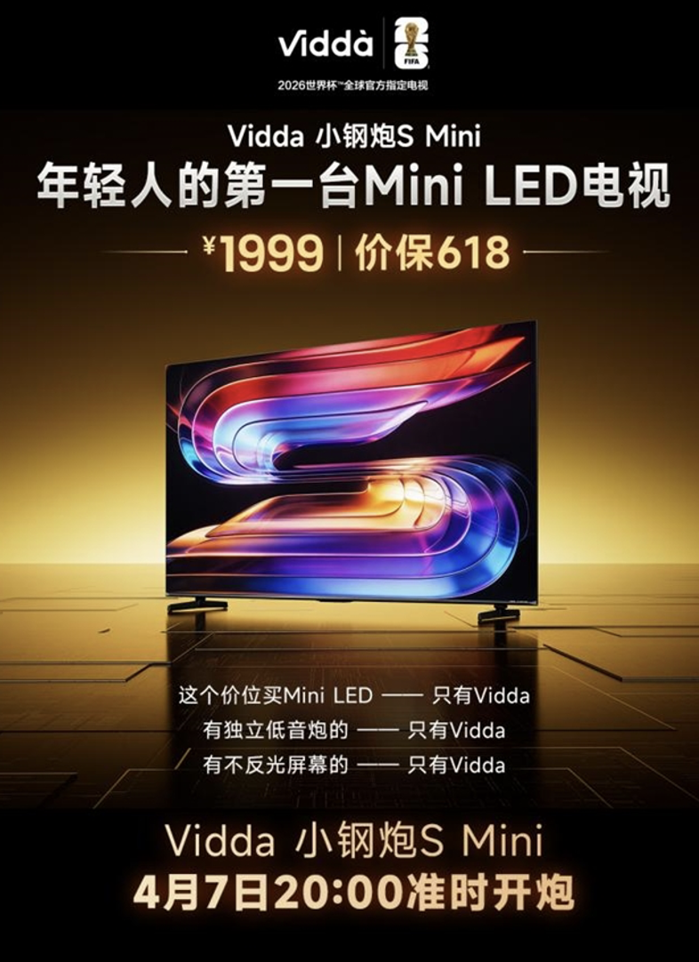 4月7日,Vidda 小钢炮S Mini正式开启全渠道预售。作为Vidda倾力打造的“年轻人的第一台Mini LED电视”,这款新品打破中端Mini LED市场“成本妥协、配置阉割”的行业潜规则,集旗舰抗光屏、MiniLED精准控光、独立低音炮、超高刷等硬核配置于一身,提供55、65、75英寸三大主流尺寸,最低1999元即可入手。让年轻人无需妥协,一步到位拉满家庭影音体验。