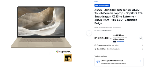 骁龙X2 Elite Extreme,48GB内存,1TB SSD,16寸2880×1800 OLED屏幕,1699美元(¥11600)。