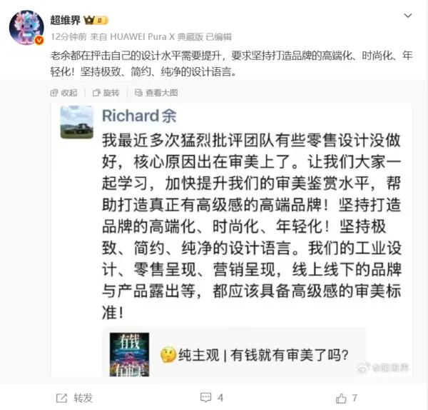 4月8日,CNMO注意到,华为常务董事、产品投资评审委员会主任、终端BG董事长余承东(英文名:Richard Yu)发文,对零售设计方面提出批评,要求团队加快提升审美鉴赏水平,帮助打造真正有高级感的高端品牌。