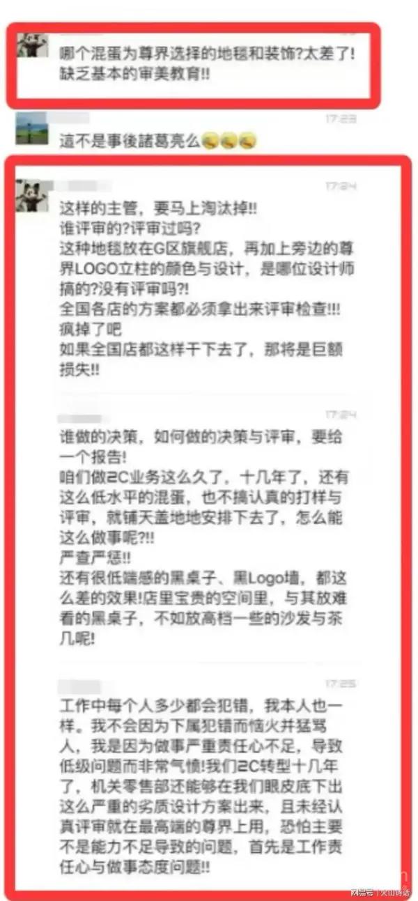 他表示,“工作中每个人多少都会犯错,我本人也一样。我不会因为下属犯错而恼火并猛骂人,我是因为做事严重责任心不足,导致低级问题而非常气愤!我们2C转型十几年了,机关零售部还能够在我们眼皮底下出这么严重的劣质设计方案出来,且未经认真评审就在最高端的尊界上用,恐怕主要不是能力不足导致的问题,首先是工作责任心与做事态度问题”!