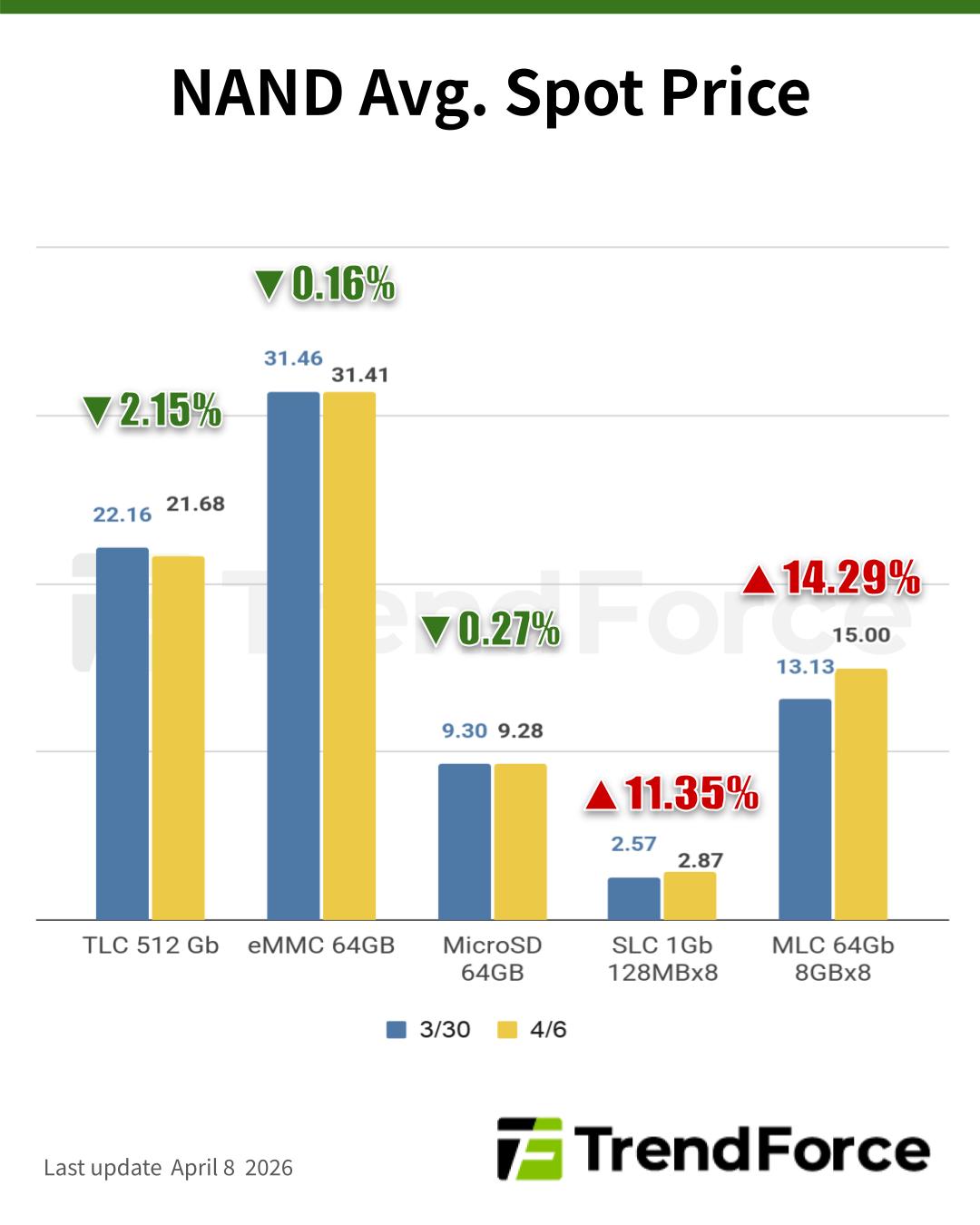 NAND Flash 现货市场本周交易表现迟滞。面对高企的价格,大多数买家选择观望,市场交投情绪低迷。卖家普遍期待 2026 年第 2 季度合约价格进一步上涨,试图借此推升现货价格。