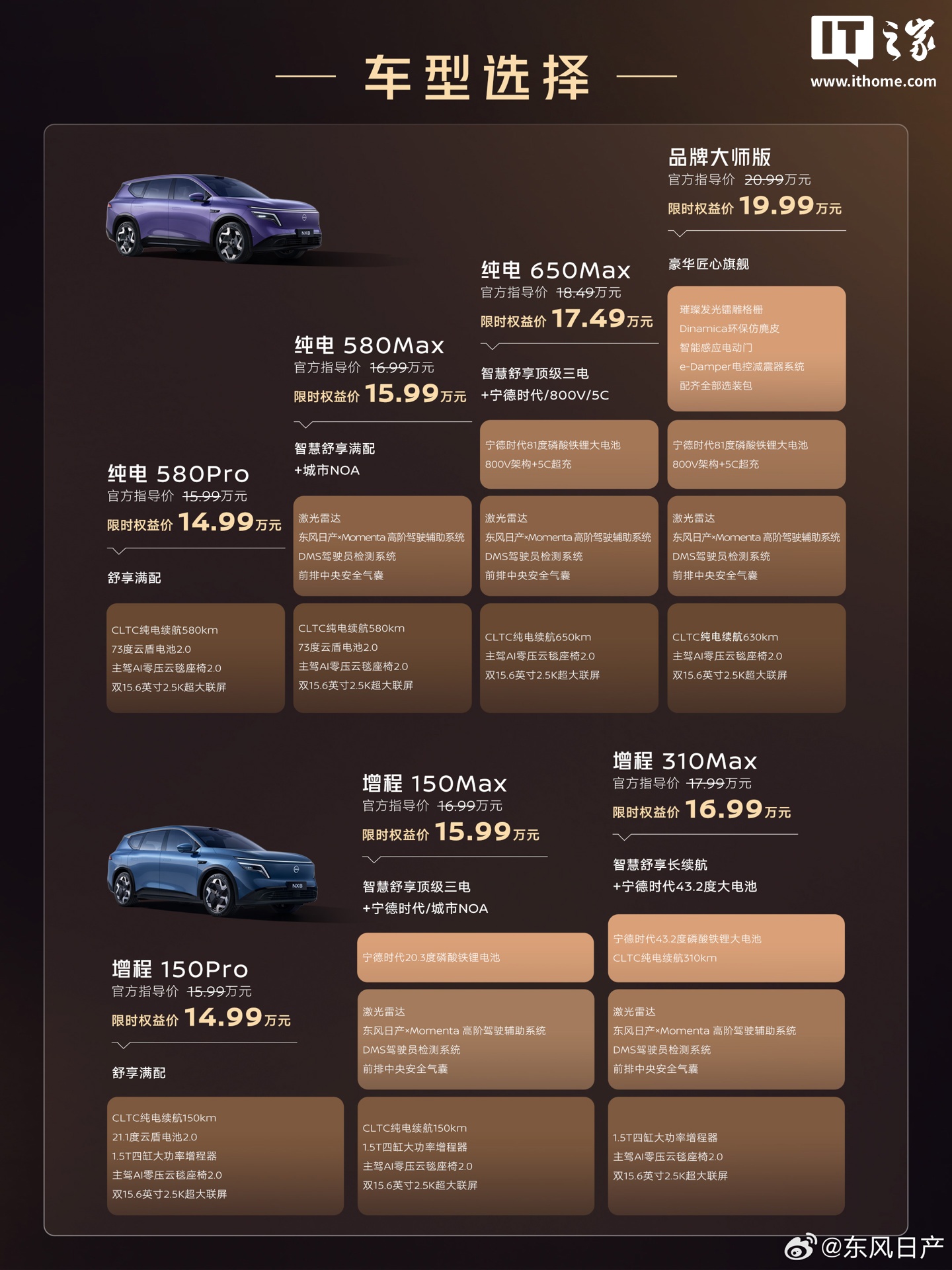 IT之家 4 月 8 日消息,东风日产首款增程 SUV 车型 NX8 今晚正式上市,采用 800V 碳化硅平台,支持 5C 超快充技术,拥有 7 种型号可选,限时权益价 14.99-19.99 万元起。