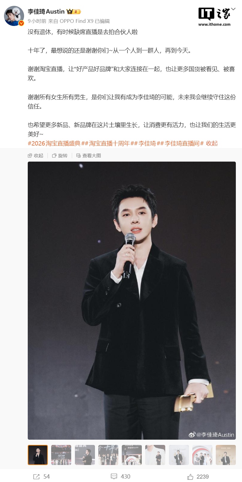 IT之家注意到,对于由此引发的一些网络传言,李佳琦随后在微博辟谣称:没有退休,有时候缺席直播是去拍合伙人啦。