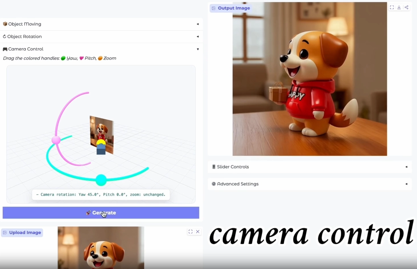 —— 用户可通过自然语言指定相机的偏航角、俯仰角及缩放程度,模型在保持场景几何一致性的前提下生成新视角图像;