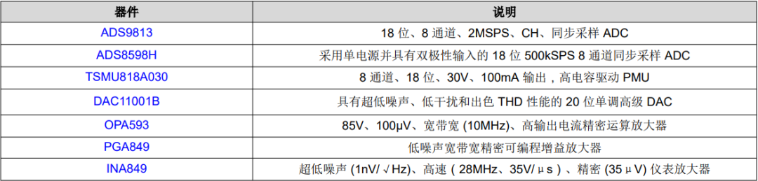 ADS9813 是 ADC 的理想选择,其宽带宽输入高达400kHz。ADS9813 的高通道密度支持更多 PMU 单元并行运行,从而减少测试时间和成本。ADS9813 能够同时对输入信号进行采样,这在测量对顺序采样引起的输入通道间相位延迟敏感时非常有用。ADS9813 器件的完整集成模拟前端具有过压输入钳位、1MΩ 输入阻抗、独立的可编程增益放大器 (PGA)、可编程低通滤波器 (LPF) 和ADC 输入驱动器。该 ADC 还具有低漂移精密基准,以及用作外部基准的集成式输入缓冲器。这些特性减小了 V/I卡等半导体测试仪卡上的信号链尺寸,而缺少额外的外部元件降低了 PMU 输出和 ADC 输入之间的误差贡献。