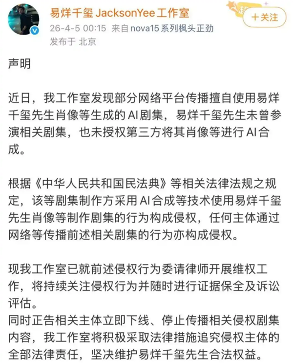 4月5日,易烊千玺工作室发布声明,称易烊千玺从未参演使用其肖像生成的AI剧集,也未授权第三方进行AI合成。