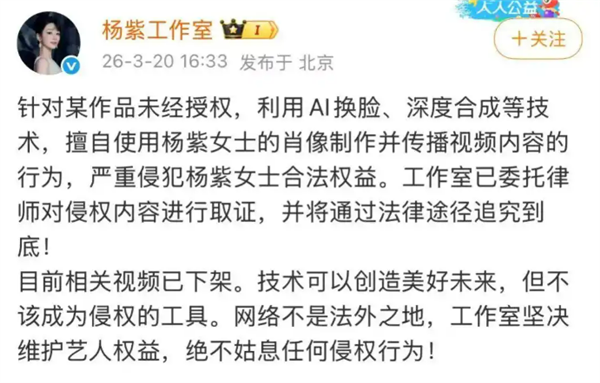 3月20日,杨紫工作室发文表示,某作品未经授权,利用AI换脸、深度合成技术擅自使用杨紫肖像制作并传播视频,已委托律师取证并将通过法律途径追究到底。