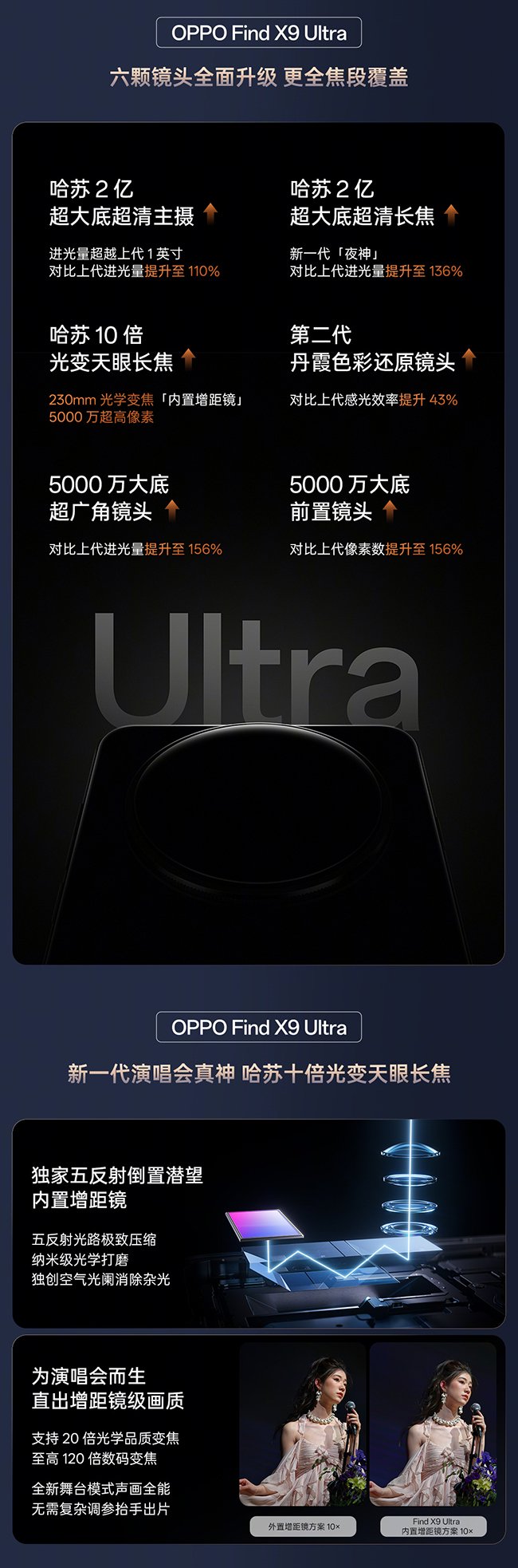 海报中还单独汇总了OPPO Find X9 Ultra的影像硬件,这颗机型堪称演唱会神器。它配备哈苏10倍光变天眼长焦,采用五反射倒置潜望结构,内置增距镜,支持230mm光学变焦、20倍光学品质变焦及120倍数码变焦,远摄画质纯净无杂光。同时,2亿超大底主摄与长焦进光量分别提升110%和156%,配合全新舞台模式,无需繁琐调参,抬手即出高清大片。