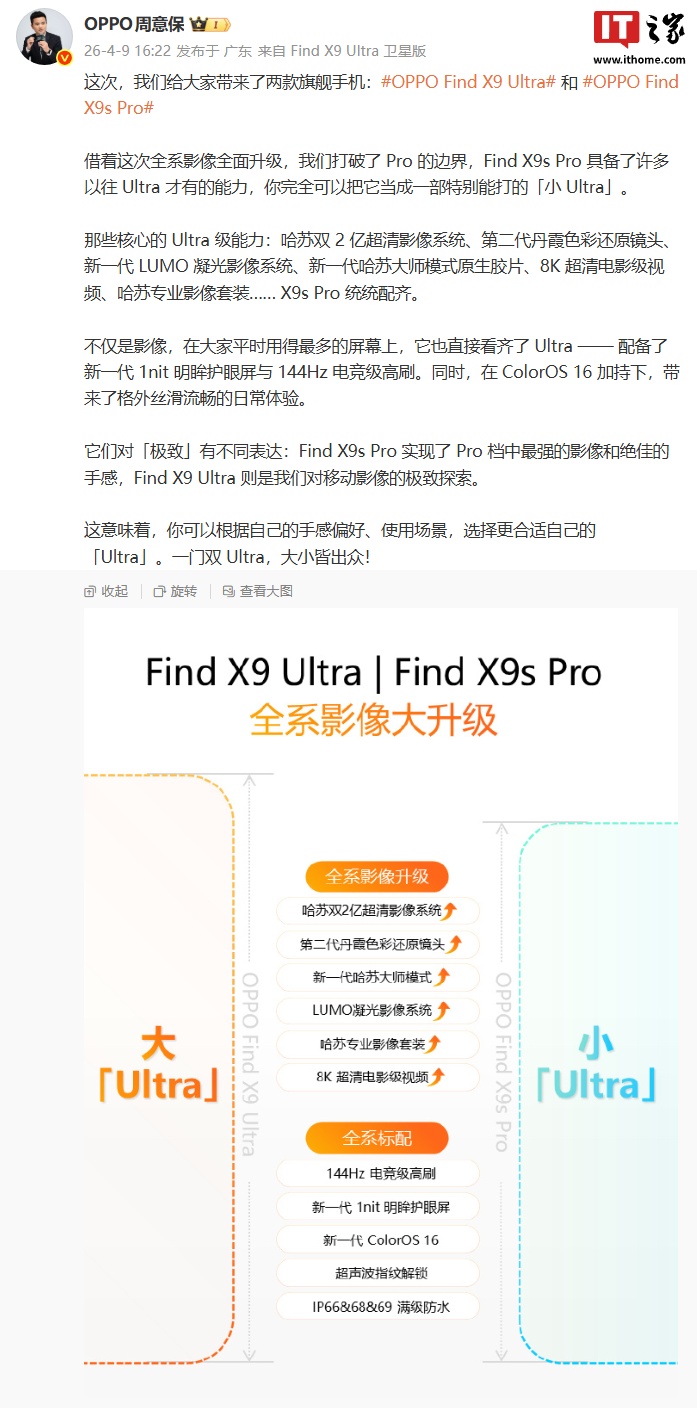 OPPO Find 系列产品负责人周意保昨日发文,透露了 Find X9s Pro 和 Find X9 Ultra 两款新机的更多信息。他表示,借着这次全系影像全面升级,OPPO 打破了 Pro 的边界,Find X9s Pro 具备了许多以往 Ultra 才有的能力,完全可以当成一部特别能打的「小 Ultra」。