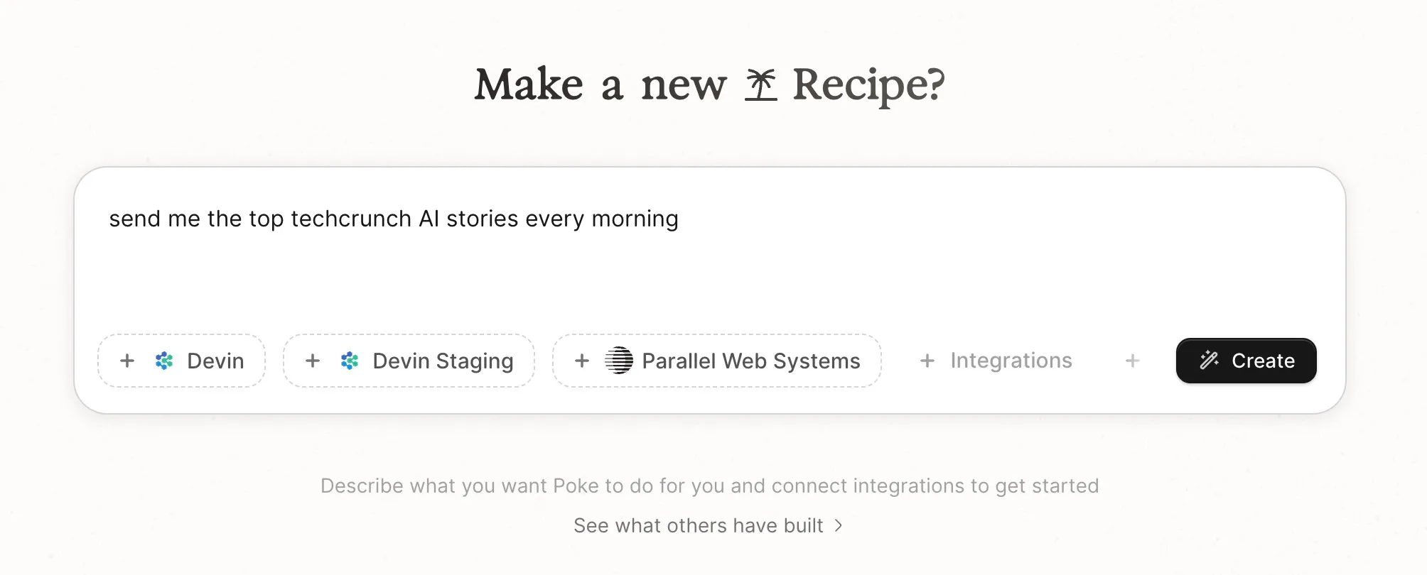 Developers using Poke can also automate parts of their workflow via integrations with tools like PostHog, Webflow, Supabase, Vercel, Devin, Sentry, GitHub, Cursor Cloud Agents, and others.