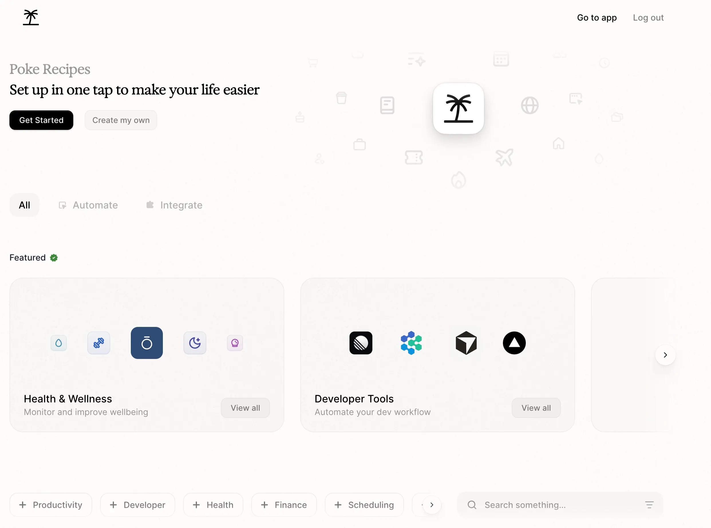 At launch, Poke offers a variety of “recipes” — or pre-made tools that help you automate various aspects of your life or work. These span categories like health and wellness, productivity, finance, scheduling, travel, home, school, email, community, and, for those who are technical, developer tools. Installing them requires a click of a button and then a standard authorization process, if needed.