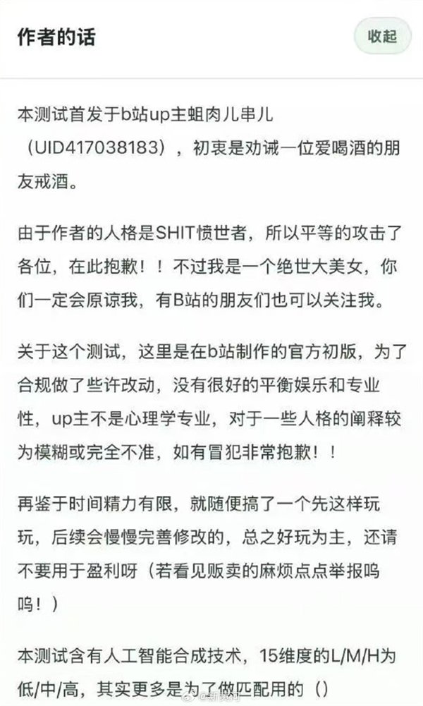她写道:由于我的人格是‘SHIT愤世者’,所以平等地攻击了每一位测试者,在此说声抱歉!