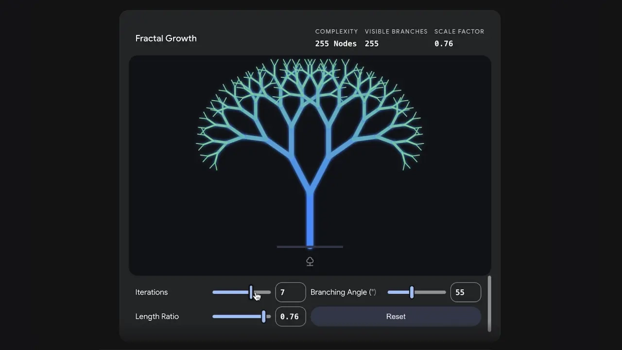 在使用方式上,用户只需在提示中加入“向我展示(show me)”或“帮我可视化(help me visualize)”等指令,并选择“Pro”模型即可。例如输入“可视化分形的生成过程”,即可看到分形生长,并可调整分支角度、长度比例和迭代次数等参数。