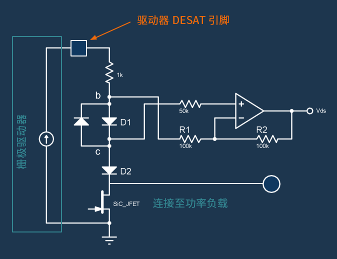 类似地,利用结温 TJ 作为关键变量,通过测量漏源电压 VDS 即可获得可靠的电流值。该方法采用两个相同的高压阻断二极管 D1 和 D2 ,与 JFET 的漏极串联连接。当结合使用栅极驱动器退饱和保护(DESAT)引脚时,可经由这两个二极管提供一个微小电流(范围在毫安至微安级别)。或者,也可从栅极驱动电源通过一个电阻提供该小电流。