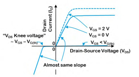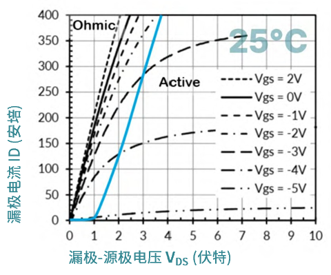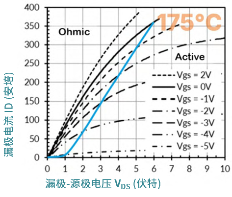图表中蓝色虚线左侧区域对应所谓的“ohmic ”区,该区域右侧蓝线之外才进入“Active”区或线性区。在“ohmic ”区内,随着栅源电压 VGS 的升高,电导率增加,电阻下降。当 VGS 达到 0V 时,JFET 完全导通,漏极与源极之间的电流沟道完全开启。若在此基础上将 VGS 继续提升约2V,导通电阻 RDS(on) 可进一步降低达 15% 。