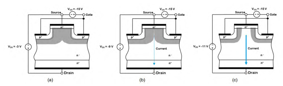 此时 VGS 与 VDS 之间的差值为 -12V,低于阈值电压 VG(th) ,因此沟道完全阻断,无源极-漏极电流通过。当 VDS 降至 -9V 且差值减小至 -6V 时,沟道略微开启,允许微小电流通过。在右图中,当差值达到 -4V(超过阈值电压2V)时,源极-漏极电流得以更自由地流动。