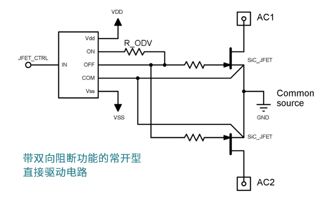 在某些应用场景中,让半导体器件处于常开状态更为便利。右侧的电路图展示了一个典型示例:通过简单的过驱动方式实现可双向阻断的直接驱动电路。在此电路中,由于器件处于常开状态,即使没有栅极驱动电源,每个JFET也处于导通状态。利用市售的栅极驱动器可直接驱动每个JFET的栅极。