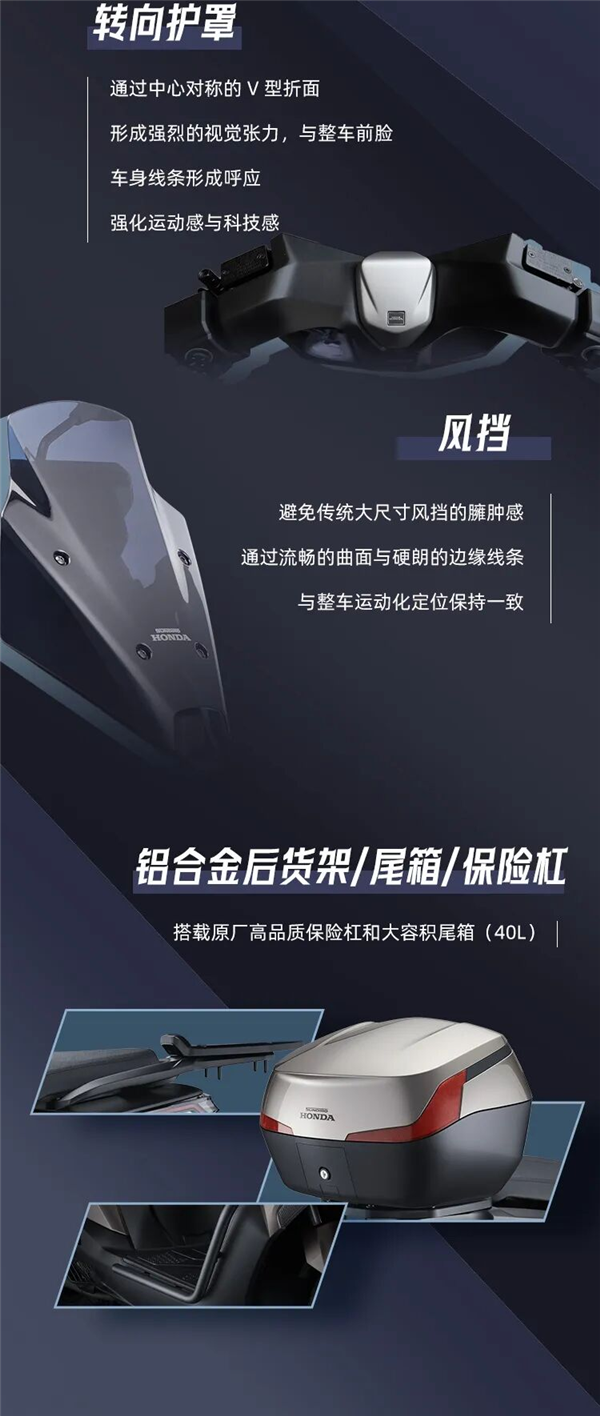 动力方面,该车搭载本田SH-EP150单缸水冷四气门发动机,排量149.7cc,最大功率11.4kW,峰值扭矩14.4N·m,具备静音启动与自动启停功能,百公里油耗约2.2L,8L油箱续航可达370km。