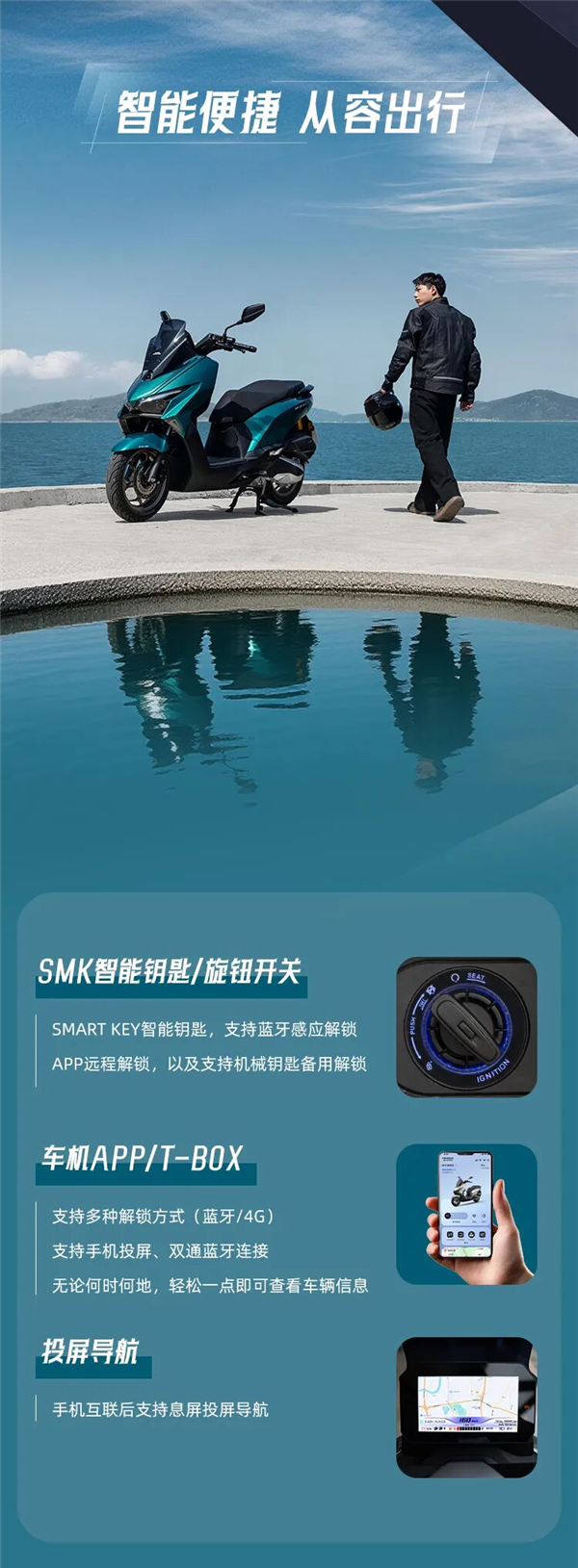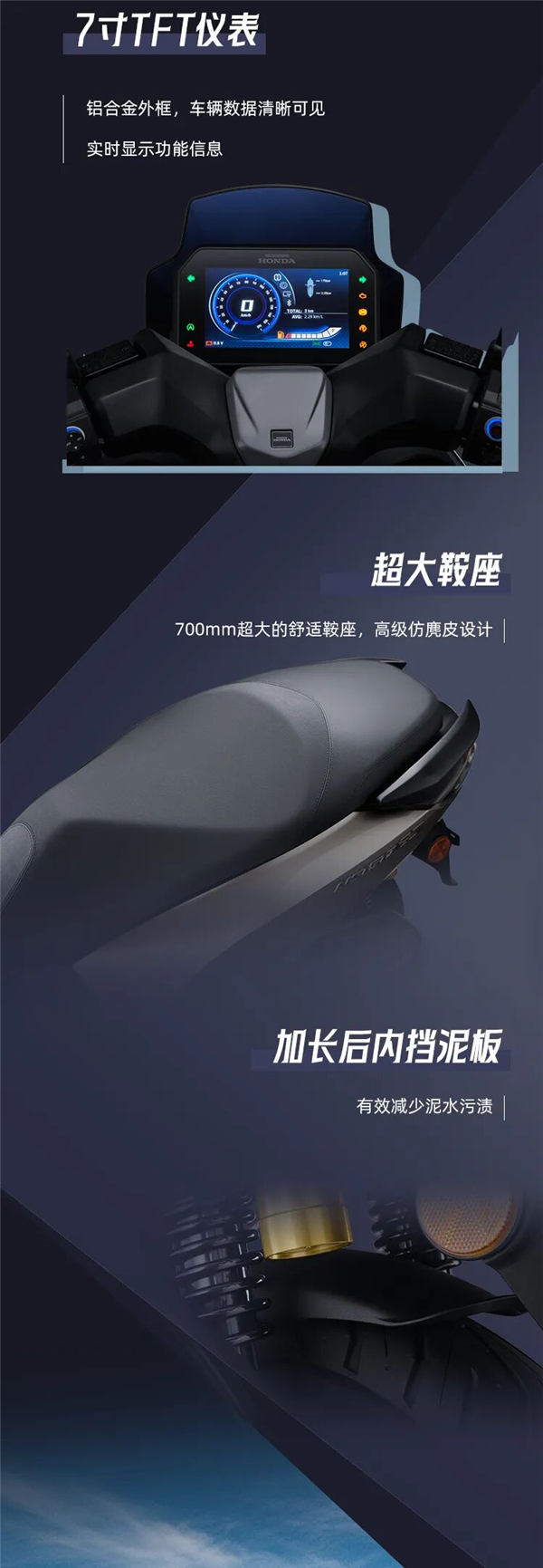 配备无钥匙启动、TFT全彩仪表、T-BOX互联系统,Pro版本还升级气囊后减震、原厂行车记录仪与胎压监测,并全系标配双通道ABS与TCS牵引力控制,保障骑行安全。