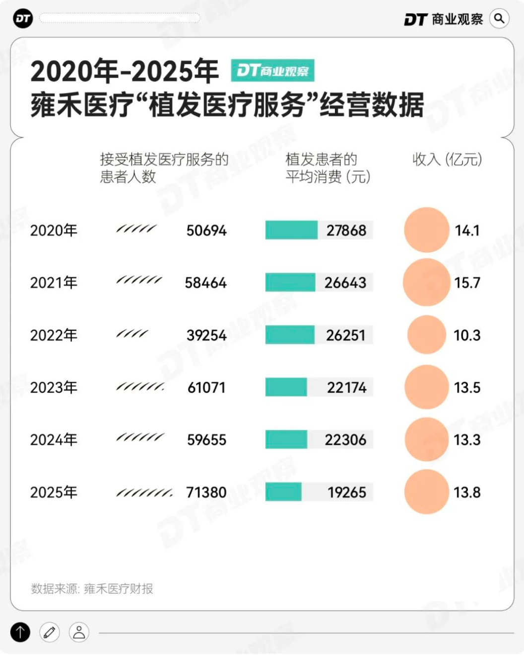2025年,雍禾全年植发人数7.14万人,同比增长19.65%,但全年植发业务收入为13.75亿元,同比增长仅3.34%,背后是平均客单价同比下滑13.63%。